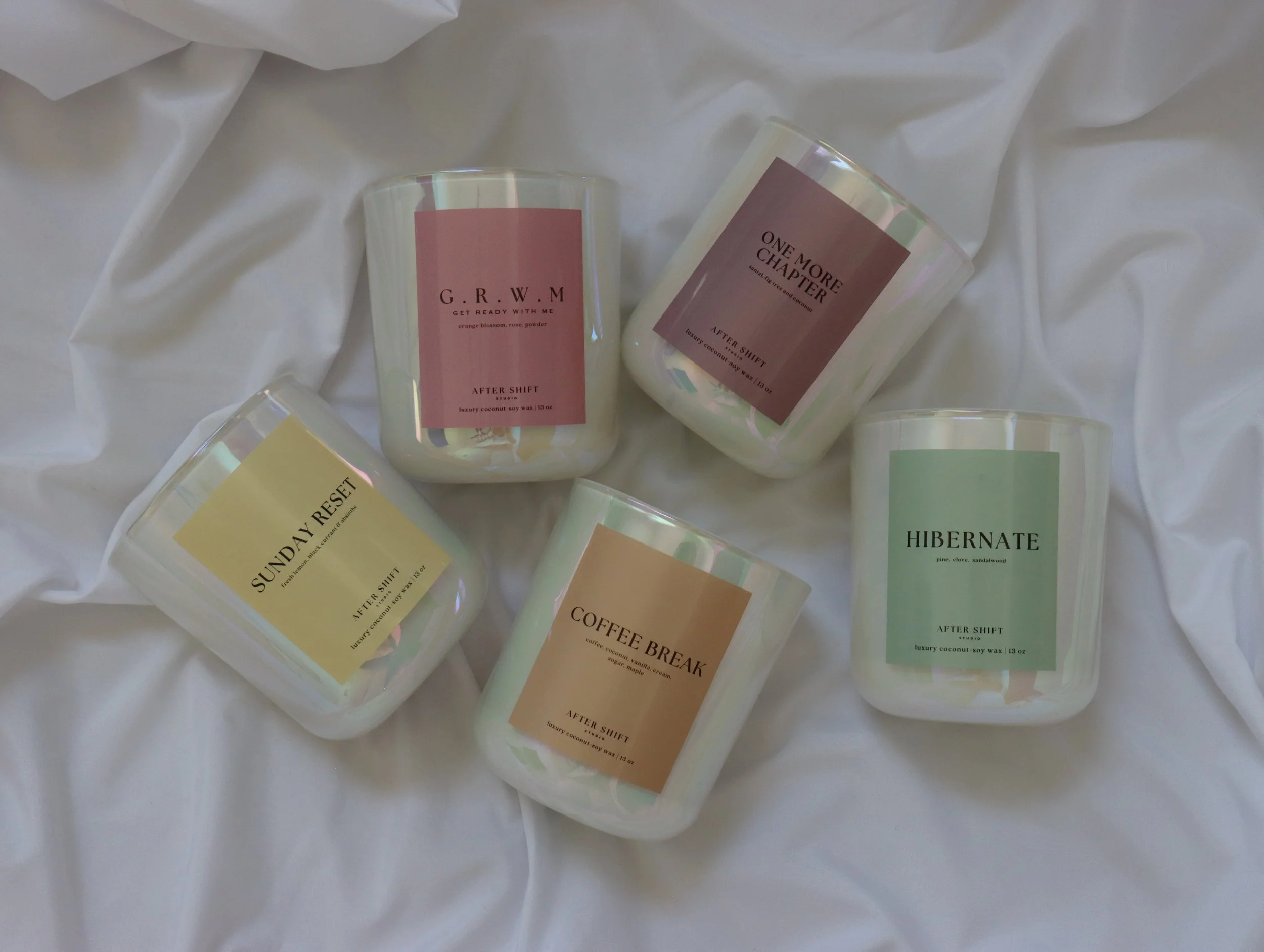 Our container candles are hand-crafted meticulously using non-toxic and natural ingredients. Paired with wooden wicks that give you that cozy and crackling sound like a fireplace. Our candles are also made with a candle-safe mineral called mica powder which gives sparkle and iridescent shine when lit.